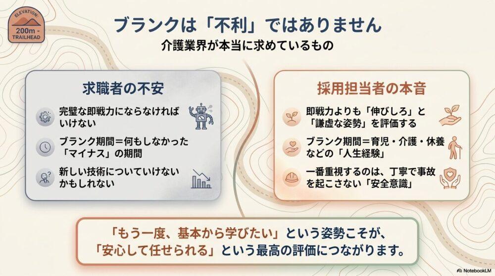 介護職への復帰を考えたとき、 多くの人がブランクを「不利」だと感じます。