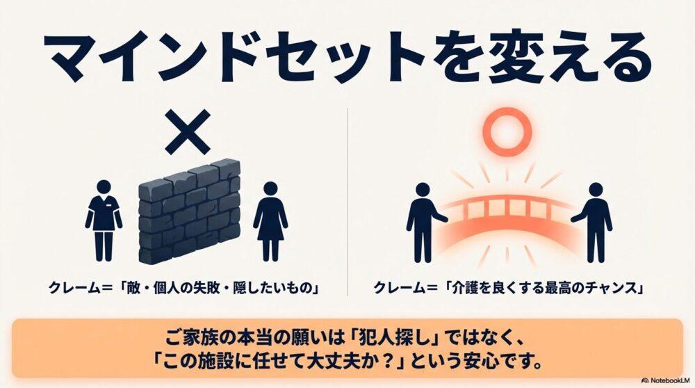 クレームは「敵」ではなく、ぼくたちの介護をより良くし、ご家族との信頼関係を深めるための「最高のチャンス」なのだと。