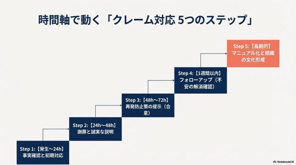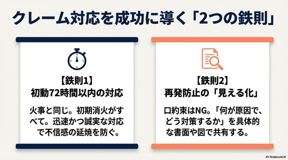 - クレームは「初動72時間」と「再発防止の見える化」が命。