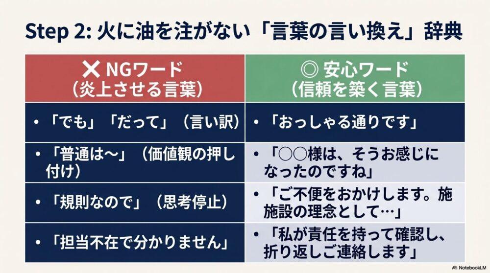 - NGワードを避け、「安心ワード」で傾聴と共感の姿勢を示す。