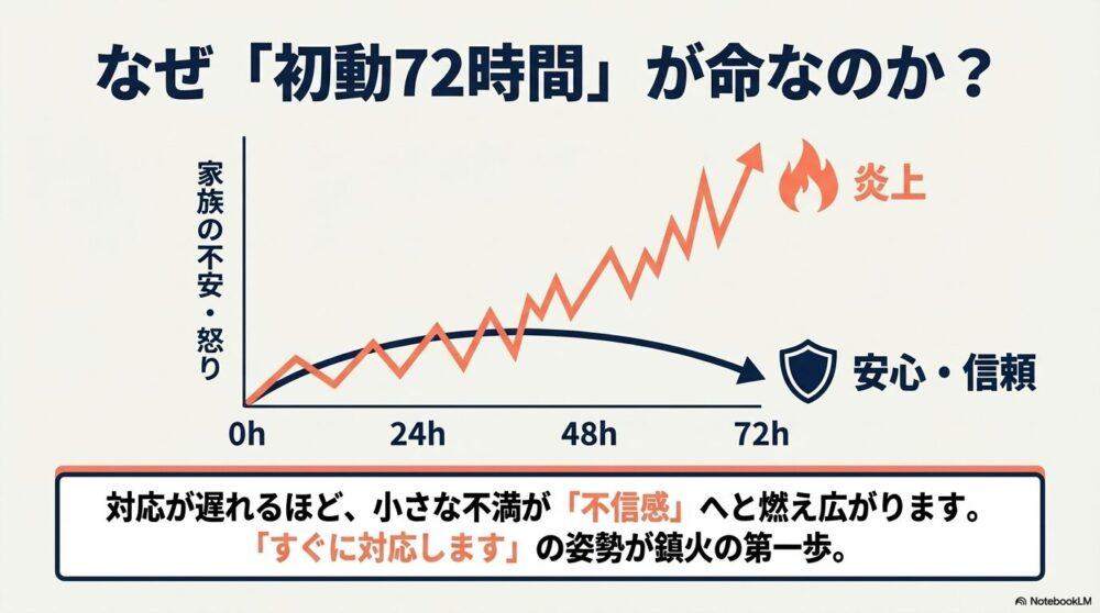 ご家族が求めているのは、事情の説明ではなく、まず「共感」と「安全への配慮」です。