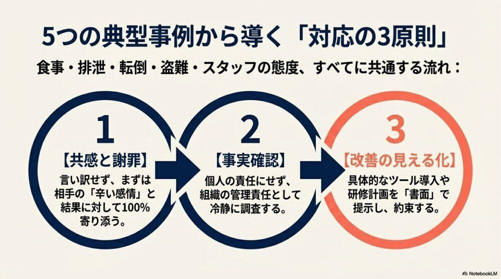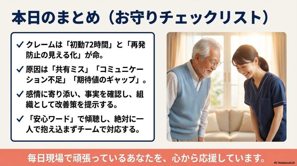 結論:介護現場のクレーム対応は“初動72時間”と“再発防止の見える化”が重要です。