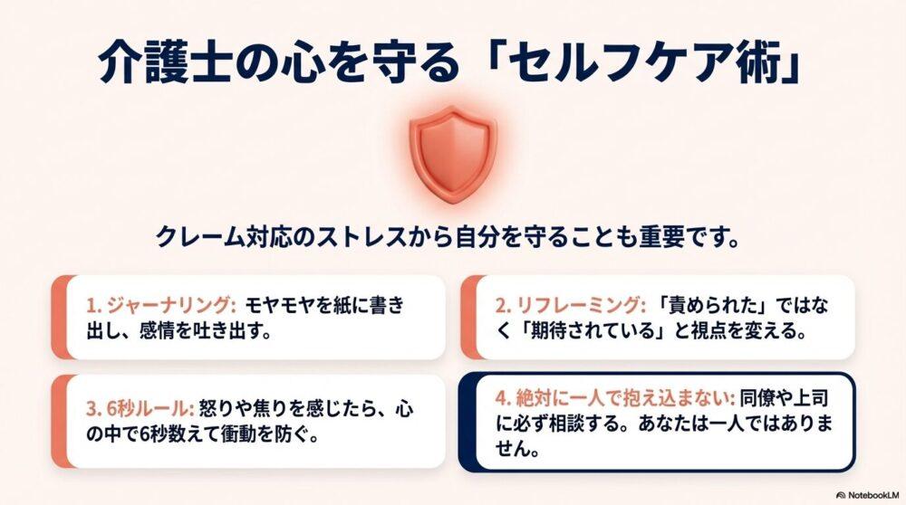 - ジャーナリング: 対応後に感じたモヤモヤを、紙に書き出す。感情を吐き出すだけで、心は軽くなります。