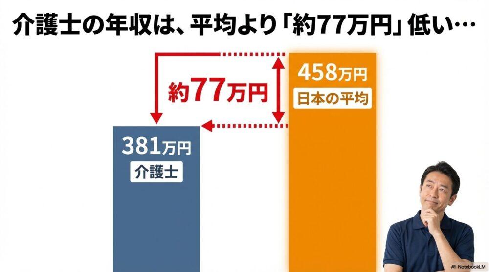 調査の結果から、介護士の平均年収は、日本の平均年収よりも約77万円低いことがわかります。