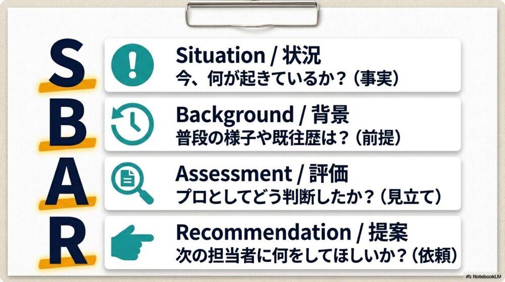 SBAR(エスバー)とは、Situation(状況)、Background(背景)、Assessment(評価)、Recommendation(提案)の頭文字を取った報告の型です。