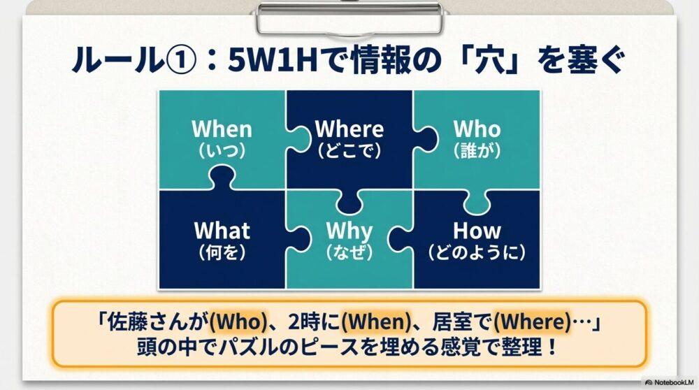 「佐藤さんが (Who)、2時に (When)、居室で (Where)…」のように、頭の中でパズルのピースを埋める感覚で情報を整理できます。