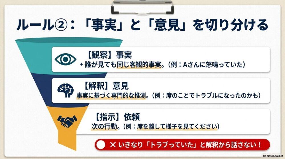 「〇〇さんがAさんとトラブっていた」と解釈から話すと、事実が曖昧になります。