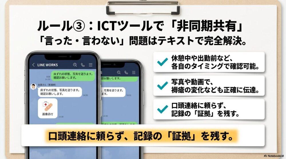 これなら、休憩中や出勤前など、各自のタイミングで情報を確認できる「非同期共有」が可能です。写真や動画も共有できるため、褥瘡の状態変化などを正確に伝えられます。