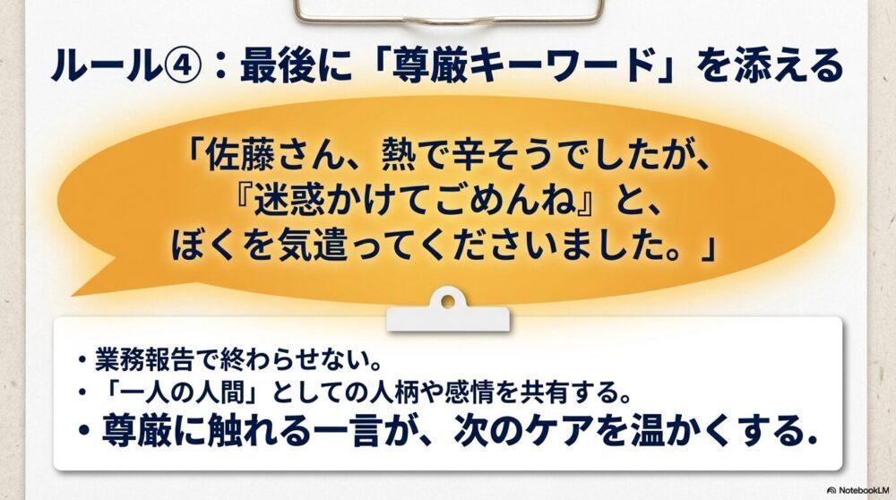 この一言があるだけで、次のスタッフは「佐藤さんは、しんどい時も人に優しくできる素敵な方なんだな。しっかりケアしてあげよう」と、温かい気持ちでケアに入れます。