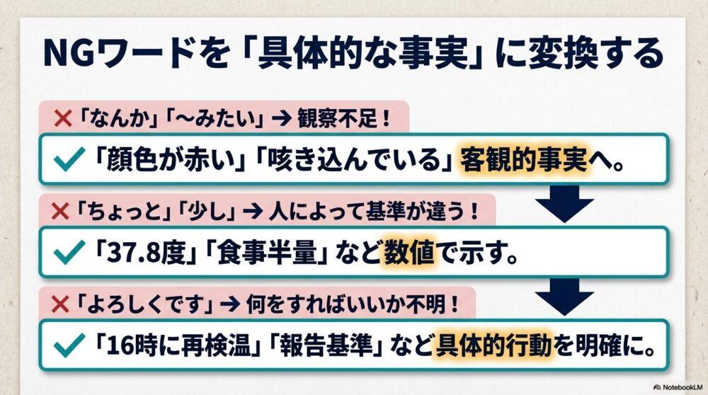 - NG:「ちょっと」「少し」 → 改善: 数値で示す(熱が37.8度、食事を半量摂取等)。