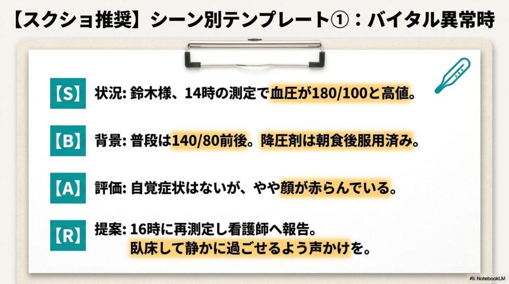 - 例:「夜勤帯の佐藤さんについて報告します。2時に訪室した際、38.5度の発熱がありました」