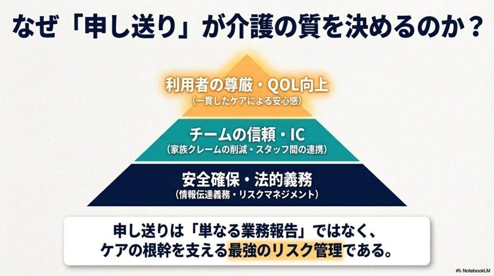 これは「記録を残せ」というだけでなく、「記録を元に、質の高いケアを継続的に提供せよ」というメッセージです。申し送りは、この法的義務を果たすための根幹業務と言えます。