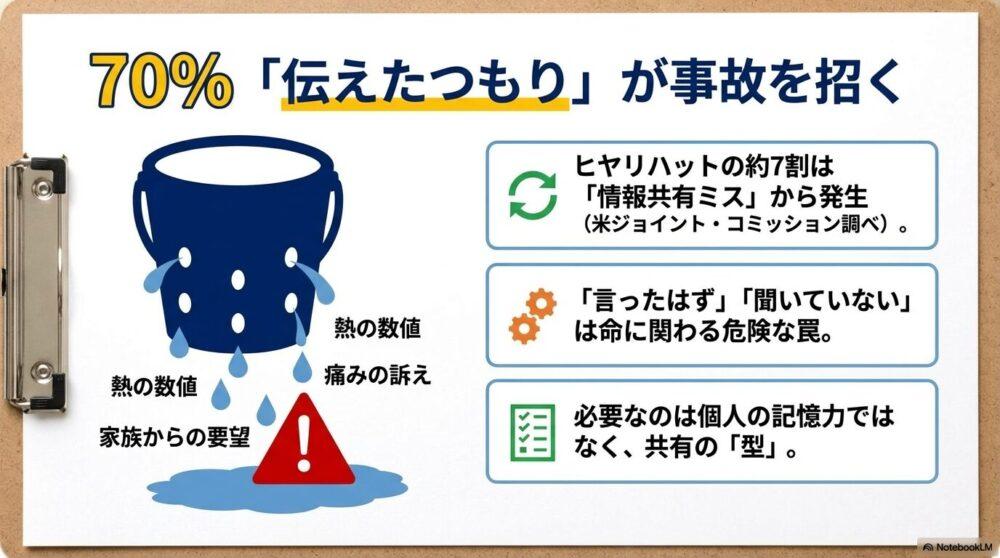 医療現場のヒヤリハットや事故事例を分析すると、その原因の多くがコミュニケーションエラー、つまり「言ったはず」「聞いていない」といった情報共有のミスに起因しているのです。