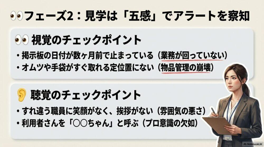 見学での赤信号(職員の表情・声かけ/掲示物の乱れ/物品の欠品)
