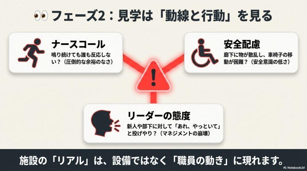 2. 見学・面接で数字と運用を確認 →職員の表情を見て、退職者数などの数字を聞く。