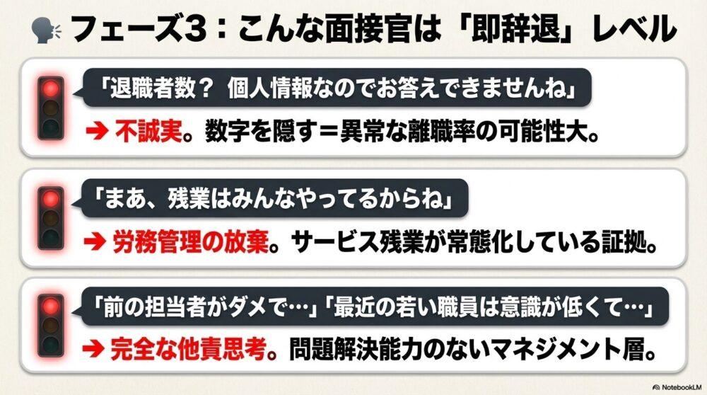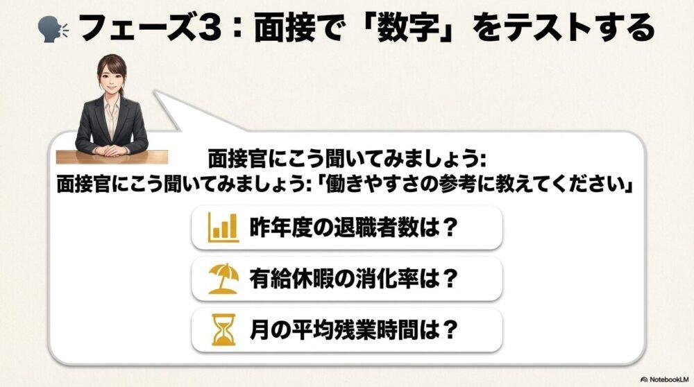 • 面接で「数字」の話を避ける: 退職者数や有給消化率を聞いて、 「個人情報なので」とはぐらかすのは危険信号です。