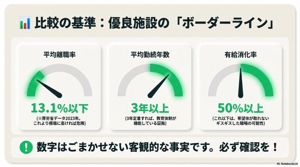 数字での赤信号(有給消化率・平均勤続年数・直近退職者数/夜勤回数の実績)