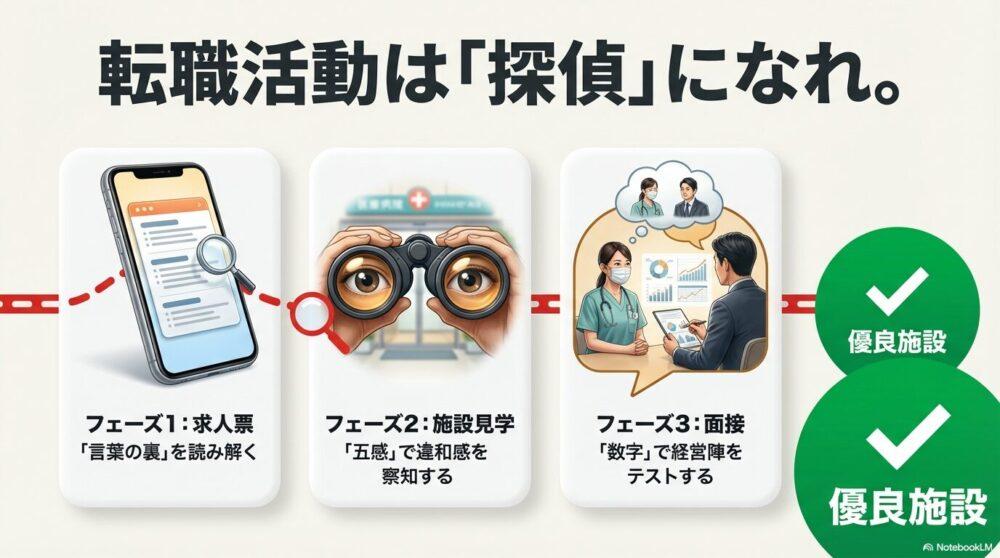 求人票、見学、面接の各段階で、 具体的にどこをチェックすればいいか、 「これだけ見ればOK」という項目に絞りました。