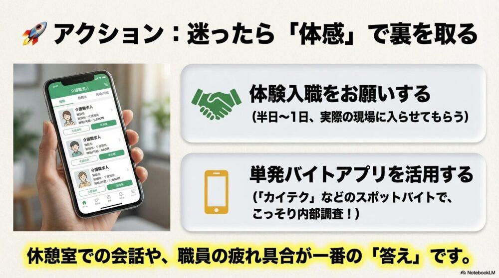 3. 短期体験で最終チェック →できれば単発バイトなどで「体感」して決める。