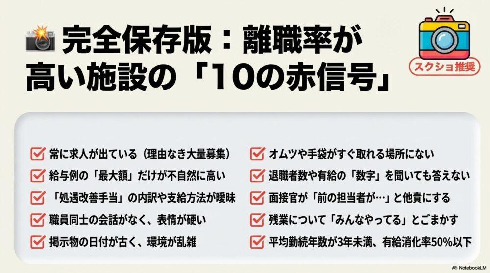 この記事を読めば、 離職率が高い「赤信号」な施設を、 入職前に見抜けるようになります。
