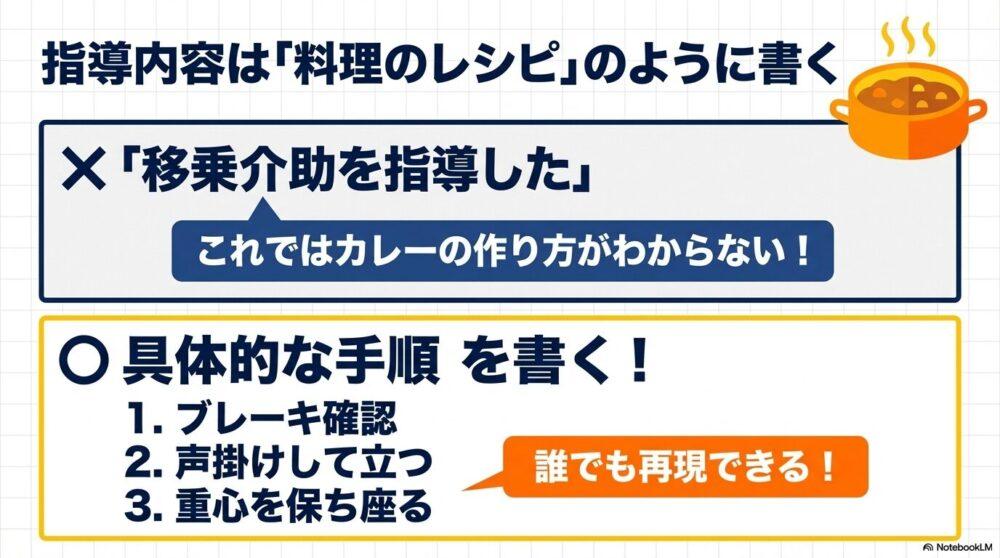 → 「今日やった移乗介助は、車椅子のブレーキ確認が大事だと分かりました」