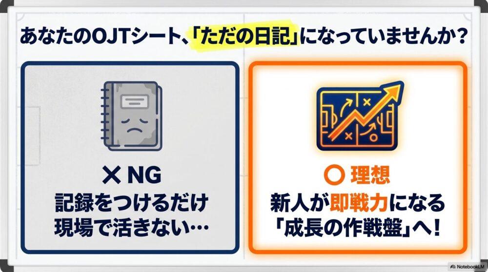 OJTシートを 単なる記録にせず、指導をスムーズにする「武器」として活用する ことで、新人育成の効果が飛躍的に高まります!