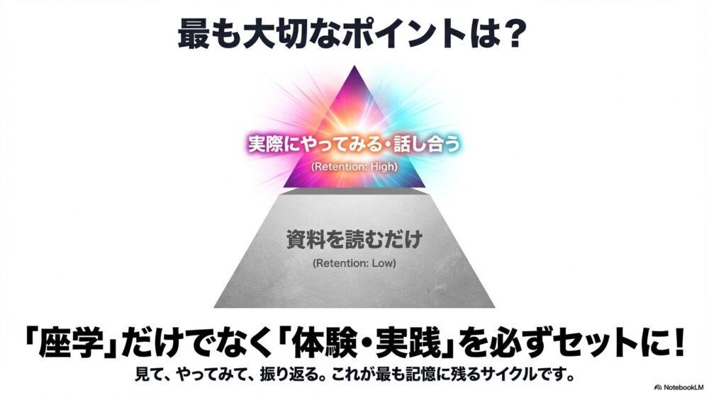 ポイント:「学ぶ → 体験する → 振り返る」の流れを作ると、記憶に残りやすい