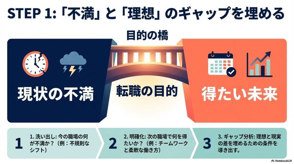 例)「今の職場では新しい技術の習得やキャリアアップの支援が十分でない。だから、転職後は最新技術の研修やキャリアパスが明確な職場を選びたい」