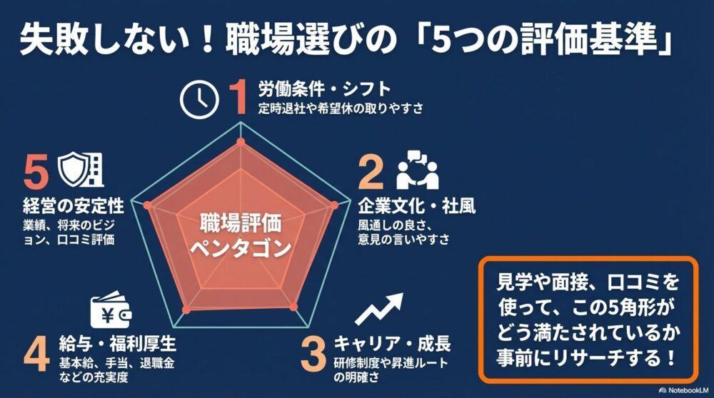 - 職場選びでは、給料だけでなく「人間関係」や「働きやすさ」もちゃんと見ることが重要。見学や情報収集をしっかり行う。