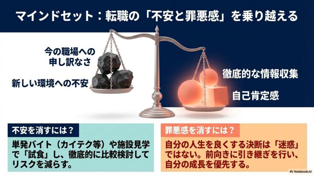 もし転職後に環境が思わしくないと感じた場合の、短期的な対策(例えば、再転職の準備や、スキルアップのための研修受講など)もあらかじめ検討しておくと、心の負担が軽減されます。