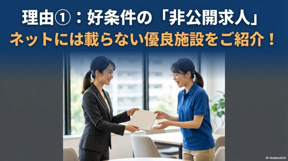 非公開求人とは、ハローワークやネットでは知ることができない、好条件の求人です。