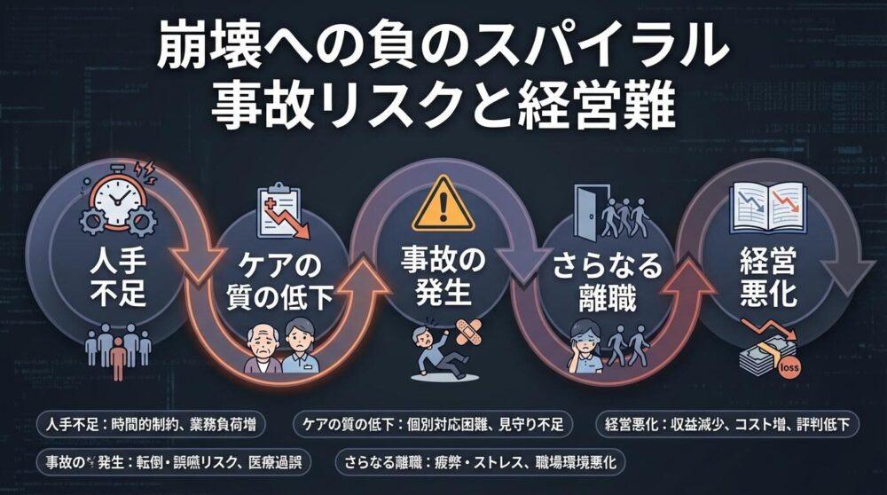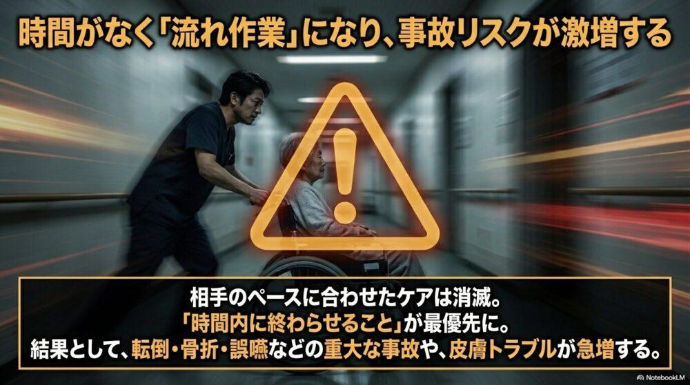 介護は「人の命を預かる仕事」です。しかし、職員の数が減ると、見守りの時間が短くなり、転倒事故や誤嚥(ごえん)のリスクが増えてしまいます。