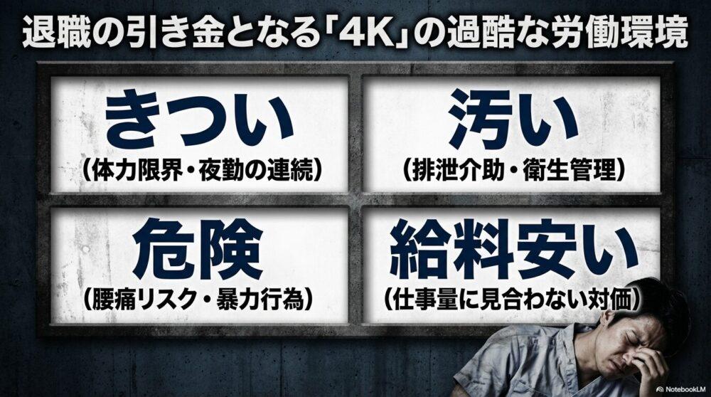 介護の仕事は、「3K(きつい・汚い・危険)」と言われるほど過酷な現場が多いのが現実です。