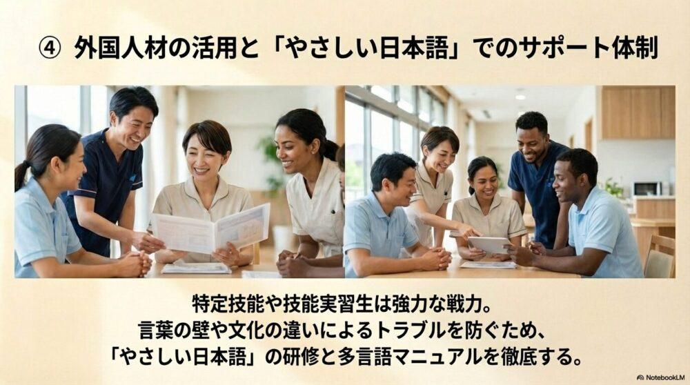 そのため、受け入れた外国人職員がスムーズに働けるように 「やさしい日本語」を使う研修 や「施設内の多言語マニュアル」を整備することが求められます。