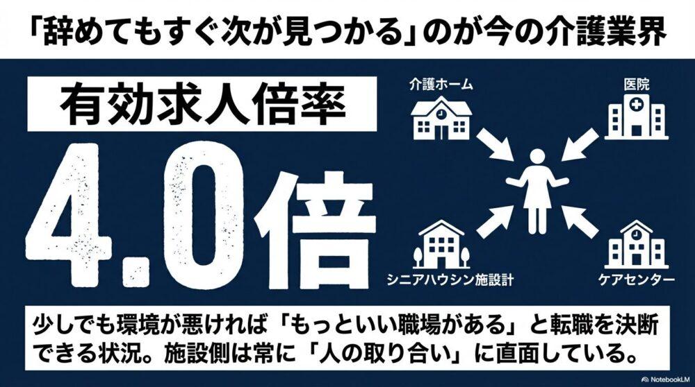 このように、介護業界は「辞めてもすぐに別の働き口が見つかる」状況が続いており、離職率の高さに拍車をかけています。