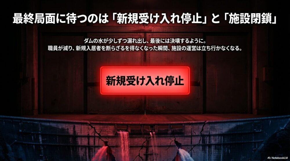 その結果、施設は 新規入所の受け入れを停止 し、最終的には運営が成り立たなくなり、閉鎖に追い込まれました。
