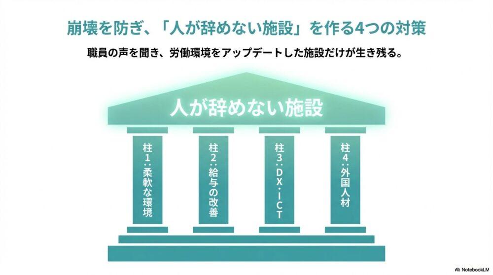 ここでは、介護施設が崩壊を防ぐための具体的な対策について、実例を交えながら詳しく解説していきます。