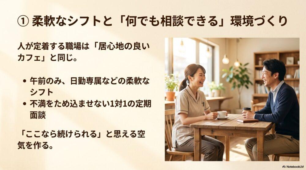 たとえば、ある施設では 「1対1の定期面談」 を導入し、管理職が職員の悩みを聞く場を設けました。
