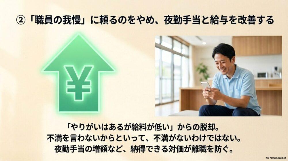 - 給与や待遇を見直し、職員の不満を減らす