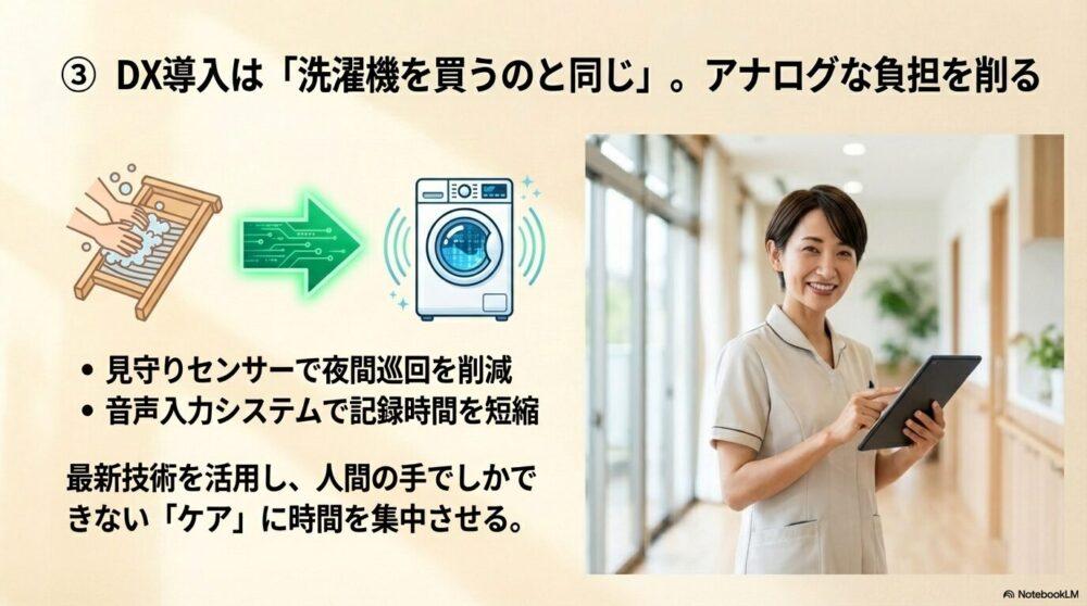 介護の現場も同じで、最新技術を導入することで、職員の負担を減らせます。