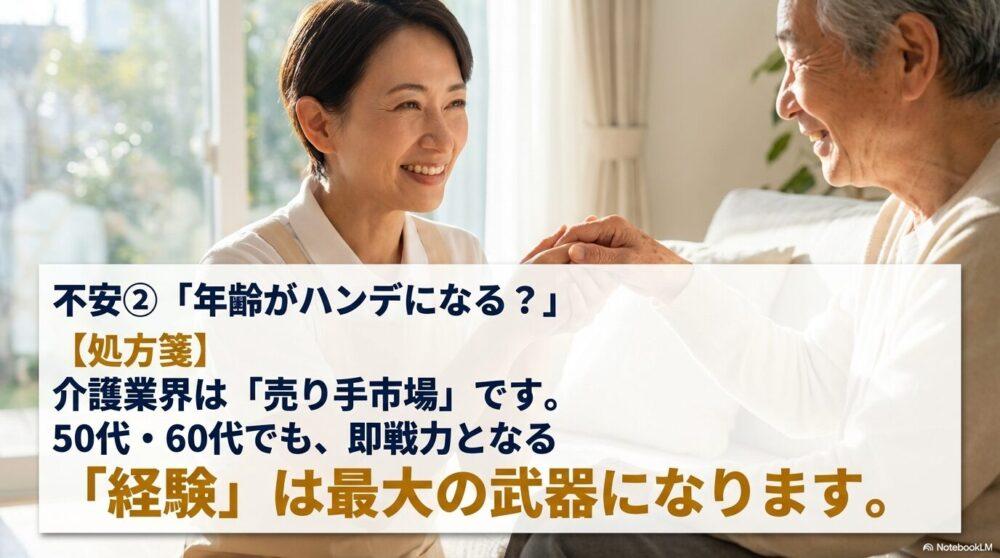 介護職は売り手市場であり、未経験者を一から育てるよりも、ある程度動ける経験者を求める職場が多いです。50代、60代でも正社員で採用されることがあるため、経験は大きな強みになりますよ。 - 転職してもまた同じことで悩むのではないですか?