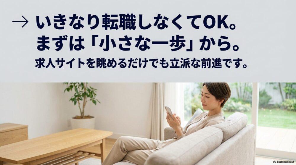 - まずは情報を集めて小さく行動することが、転職の不安を減らすいちばんの近道。