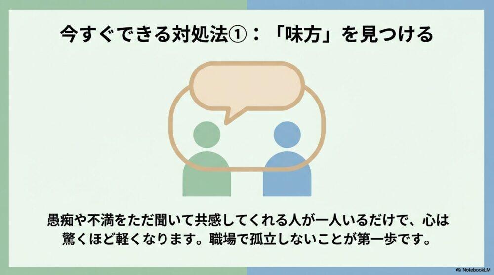 職場で一番効果的なのは、あなたの気持ちを理解し、共感してくれる「味方」の存在です。