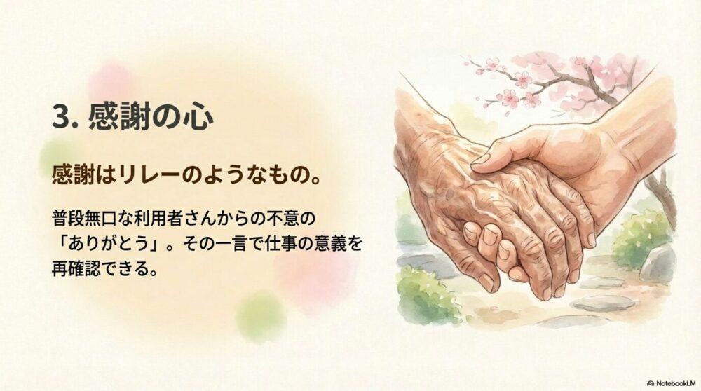 介護をしていると、つい「自分がサポートしている」という視点になりがちですが、多くの利用者さんは何気ない行動に対しても心から感謝を表現してくれます。
