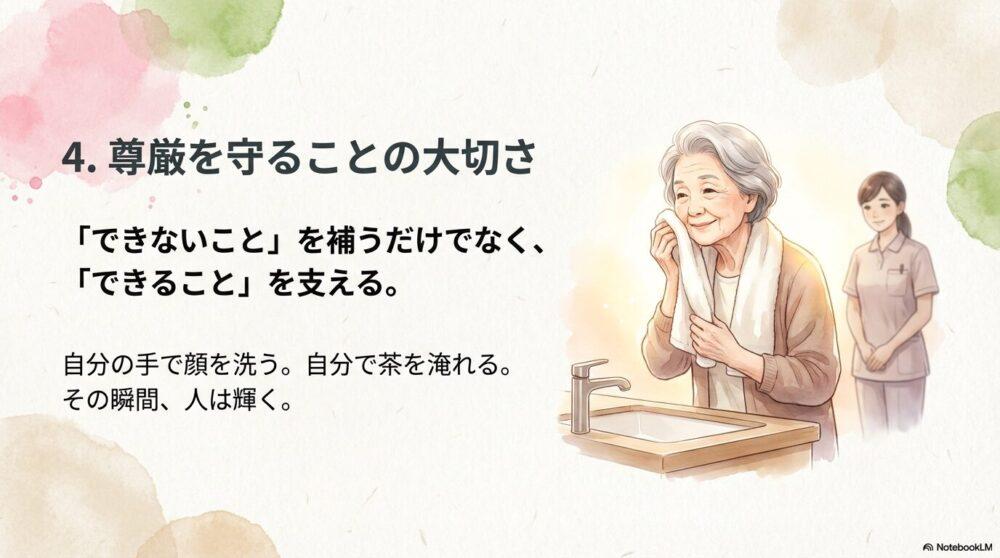 その尊厳を守ることが、介護の本質だと学びました。