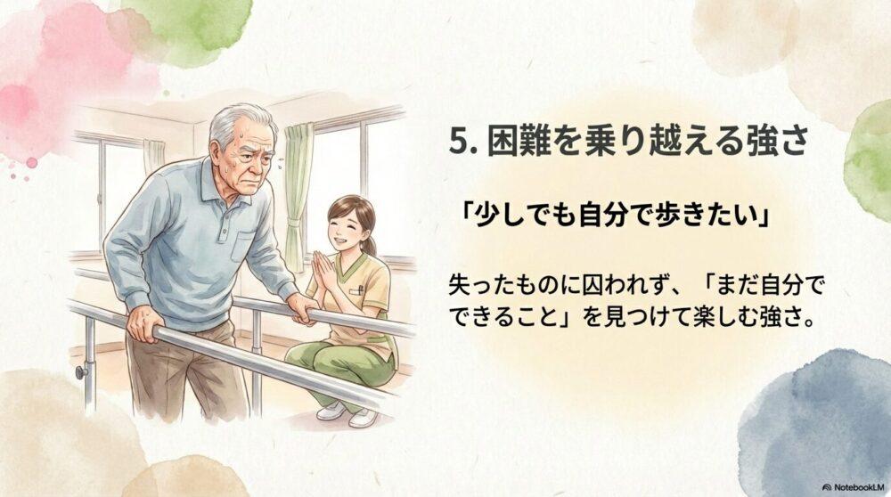 体の機能や自由が制限されても、「まだ自分でできること」を見つけて楽しむ利用者さんは、失ったものに囚われずに生きることの大切さを教えてくれます。