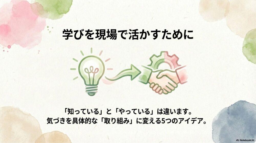 介護現場での学びや気づきを実際のケアや施設運営に反映させることが大切です。