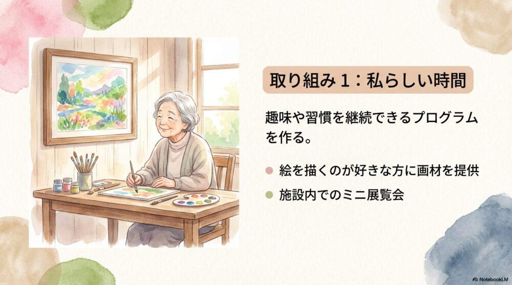 - 絵を描くのが好きな方には画材セットを提供し、施設内でミニ展覧会を開催する。