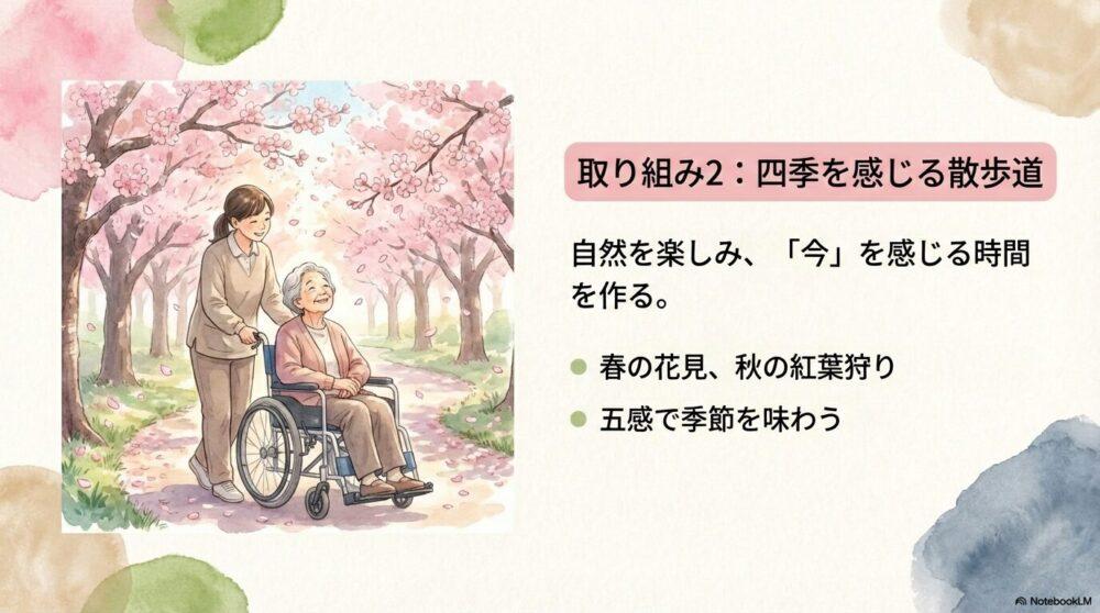 施設内や近隣に四季を感じられる散歩道を整備し、利用者が自然を楽しめる時間を設けます。