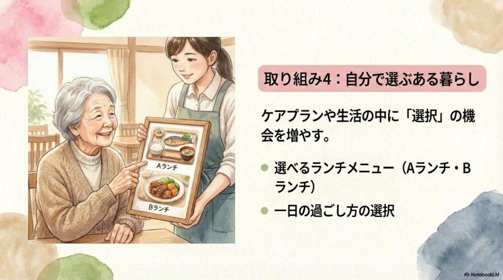 たとえば、食事のメニューを選べる仕組みや、日中の過ごし方(散歩、読書、体操など)を選択できる時間を設ける。